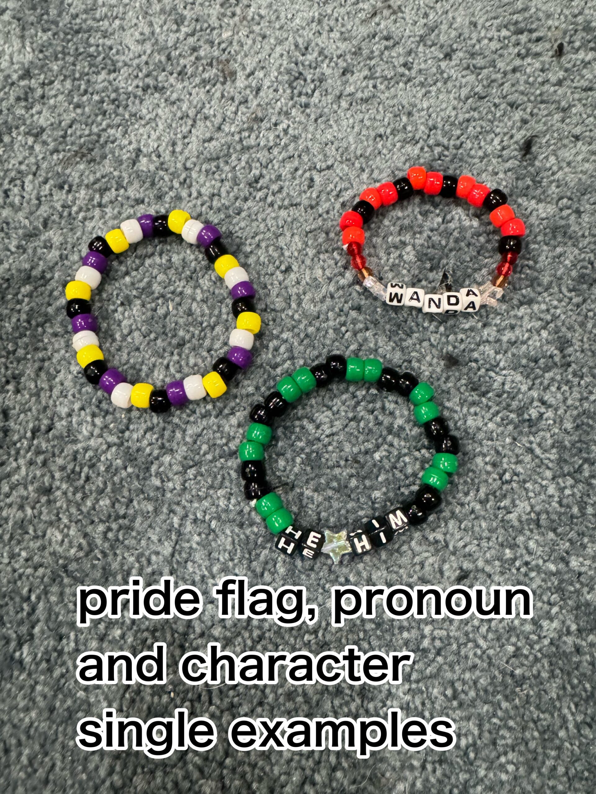 XXL— 15 singles, 2 “custom” pride flag, pronoun or character singles*, 1 mini rotator cuff, 1 worm on a string cuff, 1 flower cuff, 1 soda tab bracelet, 2 double bracelets, 15 stars, 9-10 mini kandi pieces(mini stars, bones, strawberries, flowers etc.)