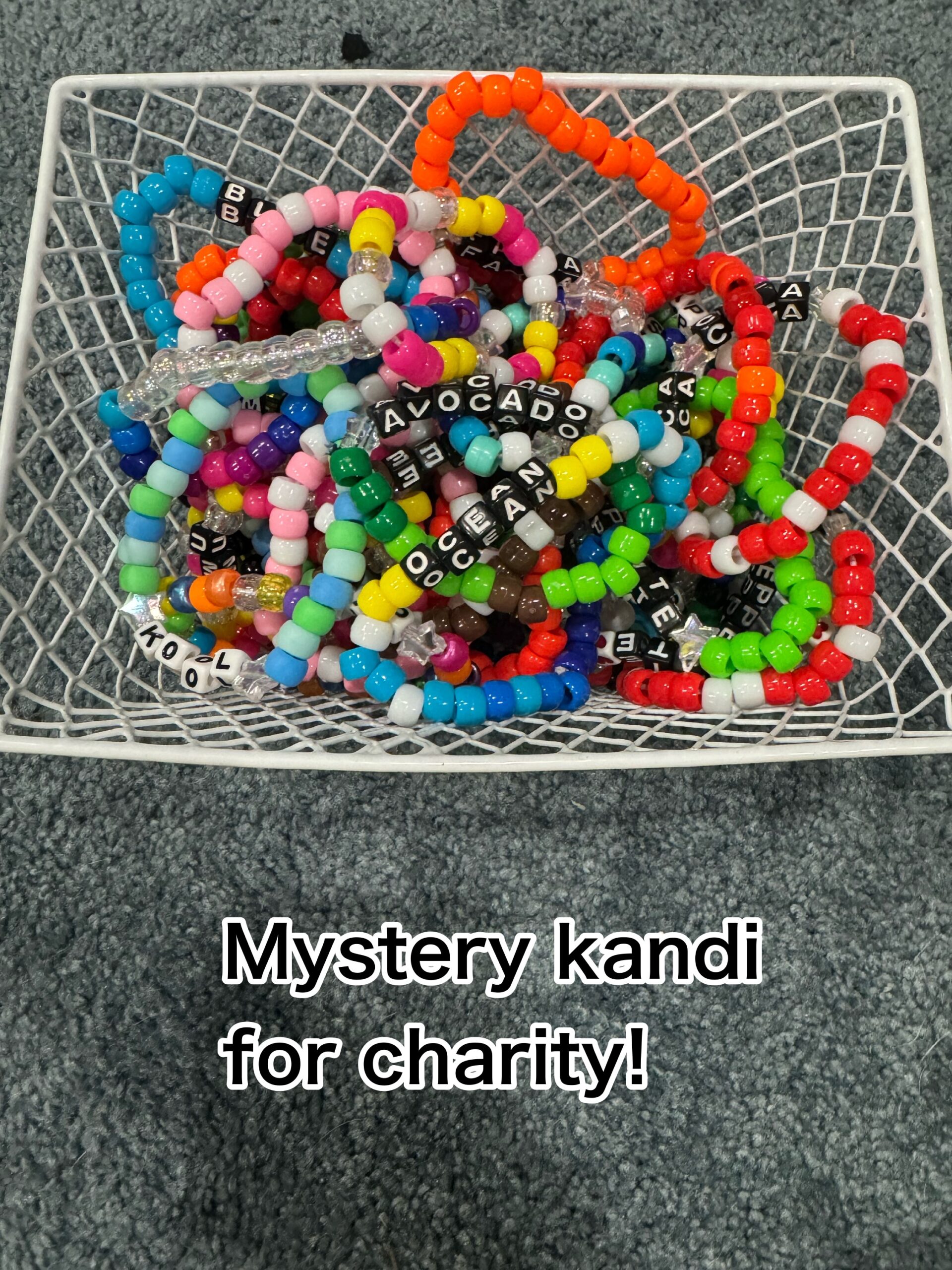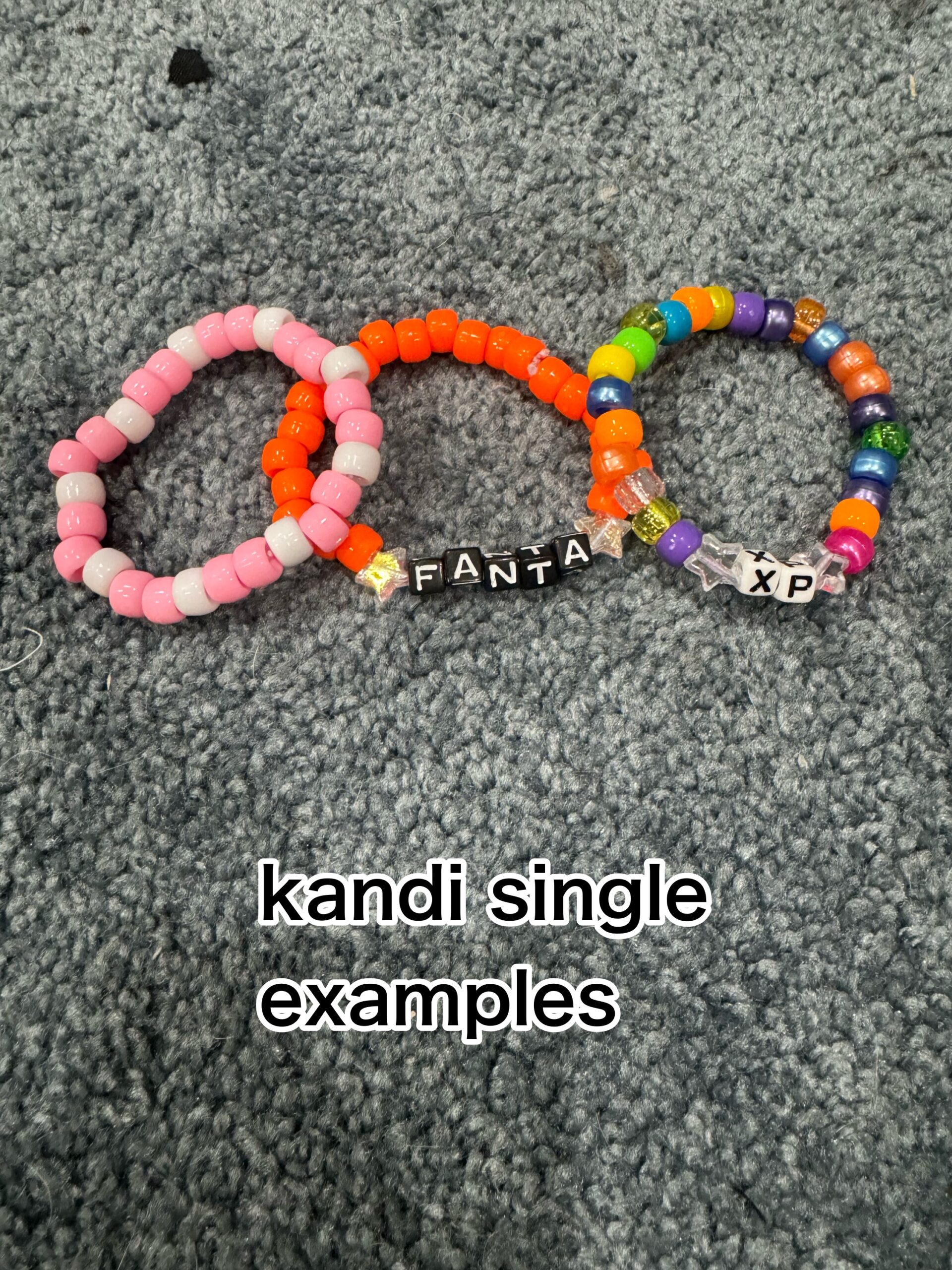 XL— 10 singles, 1 soda tab bracelet, 1 double bracelet, 1 flower cuff, 8 stars, 5-6 mini kandi pieces(mini stars, bones, strawberries, flowers etc.)